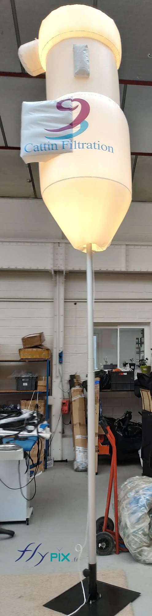 Vue générale du ballon sur mat éclairant, reproduction d’un objet industriel, et personnalisé avec une forme spéciale, pour CATTINFILTRATION